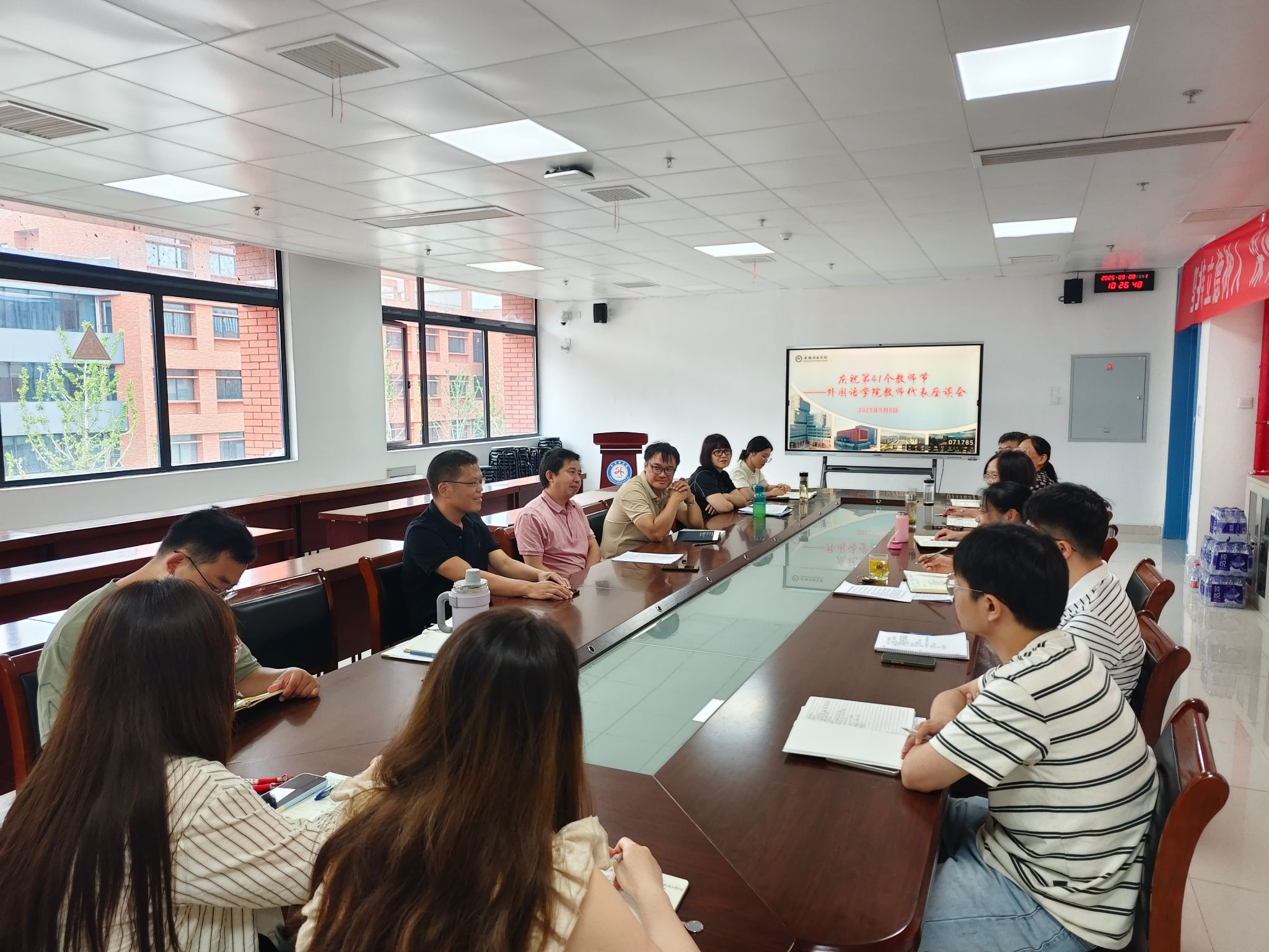 在第41个教师节来临之际,9月8日下午,外国语学院工会于学院会议室组织教师代表座谈会。学院党政领导、优秀教师代表、青年教师导师代表及近三年新进教师等20余人参会,会议由学院党委书记蔡为青主持。