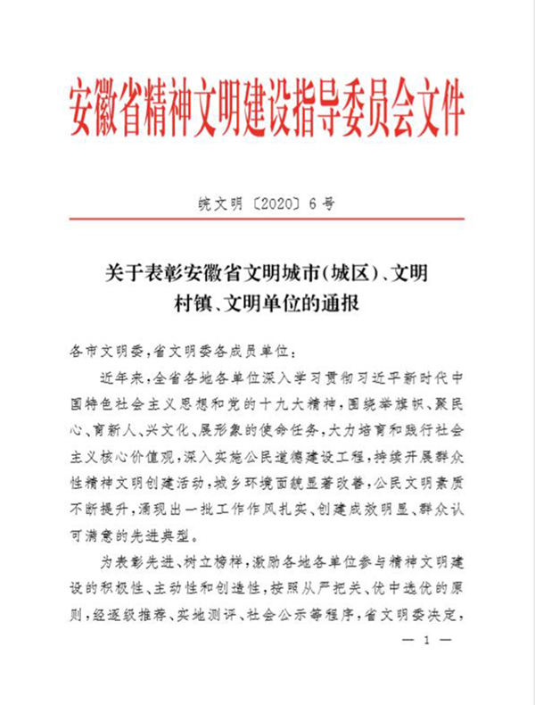 6月9日,安徽省精神文明建设指导委员会发布《关于表彰安徽省文明城市(城区)、文明村镇、文明单位的通报》(皖文明〔2020〕6号),开云线上官网_开云(中国)榜上有名,喜获“第十二届安徽省文明单位”荣誉称号。这是开云线上官网_开云(中国)首次获得省级精神文明创建成果。