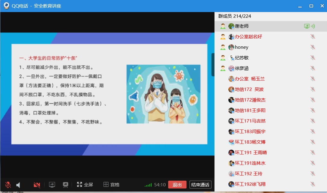 谢宜勤结合当前国内外新冠肺炎疫情防控情况,进一步介绍了当前学校疫情防控的具体方法和措施,着重讲解了疫情防控期间同学们居家学习中自我防护的《大学生的日常防护“十条”》和《大学生心理健康防护》等,希望同学们能够认清形势,继续做好居家线上学习,学会关注自身心理健康状况,及时调整,寻求帮助,并重点强调了增强网络安全意识,防诈骗传销,严防户外溺水,树立生命第一的安全观。