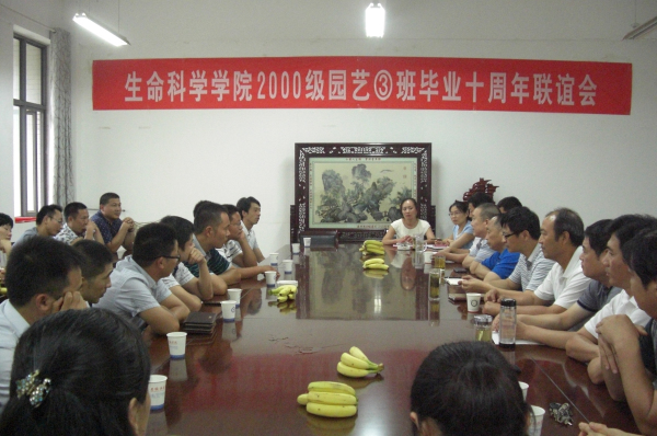 8月9日,生科院2000级园艺三班校友从祖国各地齐聚母校举行毕业十周年聚会,共叙同窗情谊,感怀母校培育之恩。生科院在学院会议室组织师生联谊会,农学院院长张子学,生科院前任和现任党政领导和部分教师代表出席联谊会。