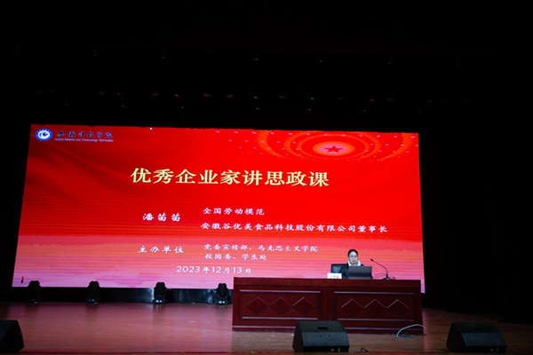 为认真贯彻落实习近平总书记关于思想政治理论课建设的重要讲话精神和党中央的决策部署,落实教育部等部门印发的《全面推进“大思政课”建设的工作方案》文件要求,充分调动全社会力量和资源,推动思政小课堂与社会大课堂相结合,挖掘一切育人资源,发挥榜样人物的示范引领作用,形成强大育人合力,激励广大学生崇尚先进、学习先进、争做先进,教育引导学生坚定“四个自信”。2023年12月13日上午,由学校党委宣传部、马克思主义学院、校团委、学生处共同举办的“优秀企业家讲思政课”在凤阳校区大学生活动中心举行。此次邀请全国劳模、安徽谷优美食品科技股份有限公司董事长潘苗苗讲授创业思政课。近200名学生和马克思主义学院老师参加活动,活动由马克思主义学院院长张德化主持。