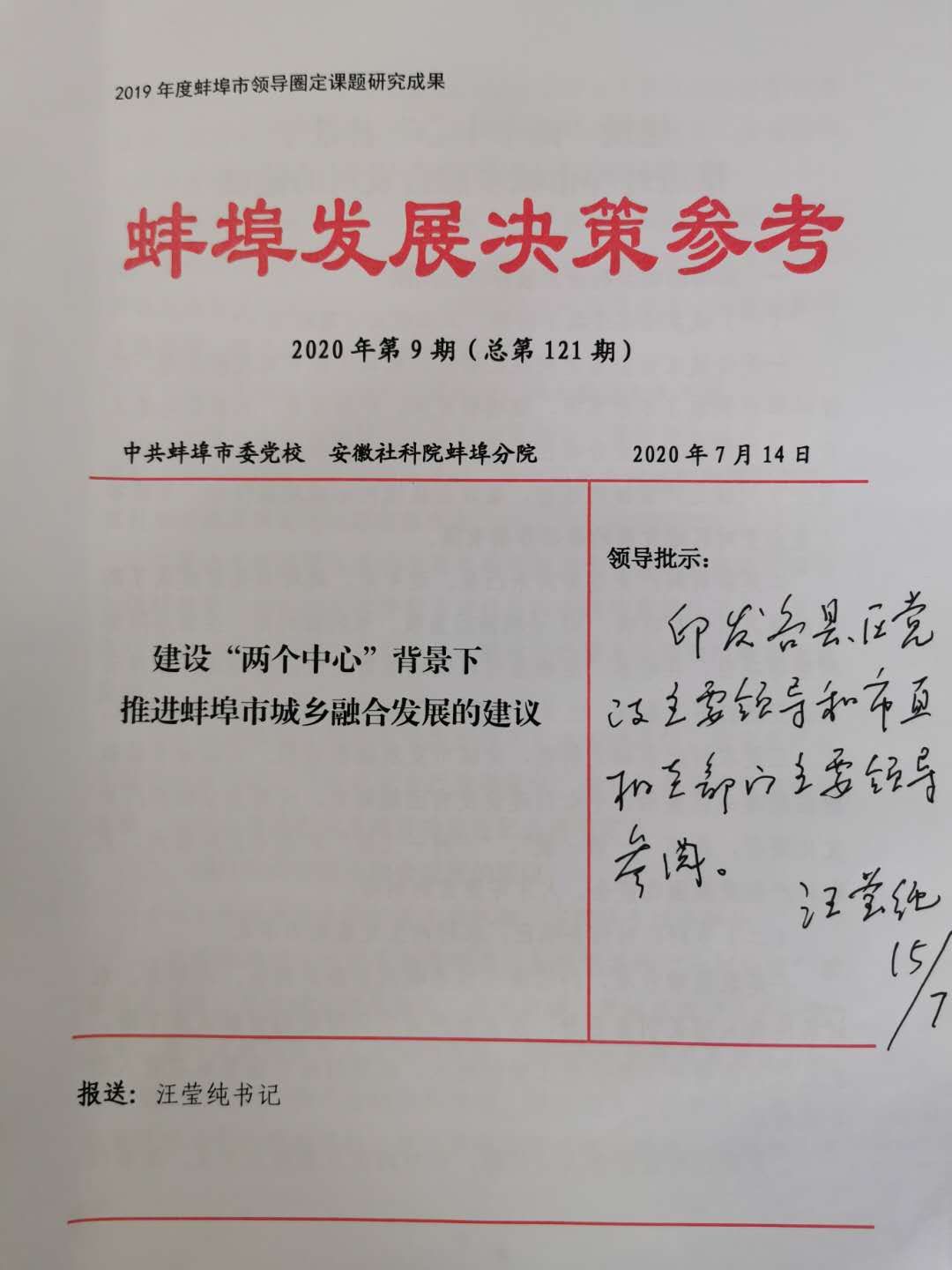 近日,由开云线上官网_开云(中国)管理学院赵伟峰教授撰写智库研究报告《建设“两个中心”背景下推进蚌埠市城乡融合发展的建议》,获得蚌埠市委书记汪莹纯同志明确批示。批示全文:“印发各县区党政主要领导和市直机关部门主要领导参阅”。