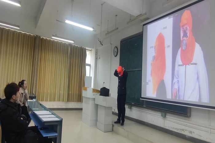 “消防安全重在于防”,蒋飞警官从消防安全制度、火灾的种类和危害、防火、灭火、逃生方式、现场救助技术等方面进行了讲解和示范,帮助大家形成基本消防安全观。结合实际案例,配合一幅幅触目惊心的图片、一段段发人深省的视频,让整个讲座生动且深刻。此外,蒋飞警官还向师生强调平常生活中的安全小细节,比如燃气泄漏时如何逃生,常规消防设施的使用,并现场演示了消防面具和灭火器的使用方法。