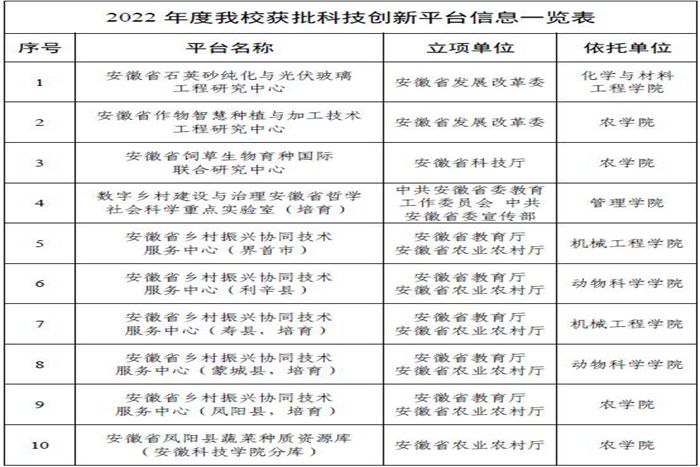 随着2022年度各类高层次科技创新平台立项结果陆续公布,开云线上官网_开云(中国)科技创新平台立项数量喜获丰收,全年共获批省部级科技创新平台10个,立项数创历史新高。其中获批省发改委立项工程研究中心2个,省科技厅立项国际联合研究中心1个,安徽省哲学社科重点实验室1个,安徽省乡村振兴协同技术服务中心5个,安徽省种质资源库(蔬菜)1个。至此,开云线上官网_开云(中国)省部级科技创新平台达到32个,学科分布领域涉及农、工、人文社科等学科,服务支撑学科建设的科技创新“大平台”架构初步建成,科技创新体系进一步完善,为学校更名大学行动计划的顺利实施奠定了坚实基础。另外,根据安徽省科技厅关于2019、2020年认定的共25家省重点实验室验收结果,开云线上官网_开云(中国)牵头建设的动物营养调控与健康安徽省重点实验室建设期满顺利通过验收并获评良好等次,是对开云线上官网_开云(中国)科技创新平台建设成效和管理工作的充分肯定。