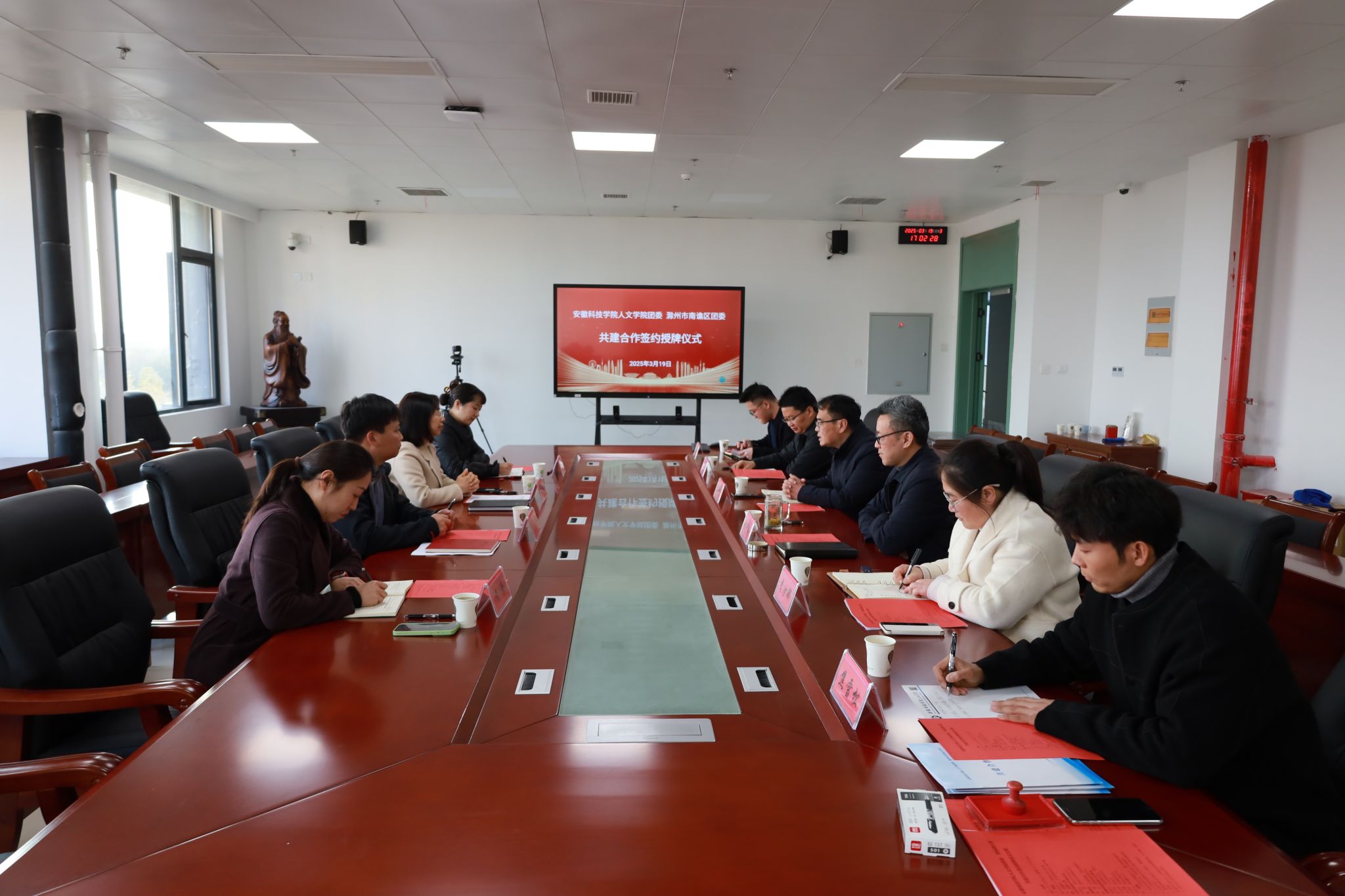 为不断创新共青团工作机制,推进校地团学资源融合,实现优势互补、合作共赢,更好服务广大青年的成长成才,3月19日下午,人文学院团委与滁州市南谯区团委举行共建合作签约授牌仪式。共青团滁州市委书记李国金、副书记戴莺,南谯区委常委、组织部部长程娟,共青团南谯区委书记徐迟,学院党委副书记、院长李晓东,正处级组织员张严政,副院长牛永辉,党委副书记李沙娜,党政办副主任方明旺,团委副书记焦雪松等出席,仪式由张严政主持。