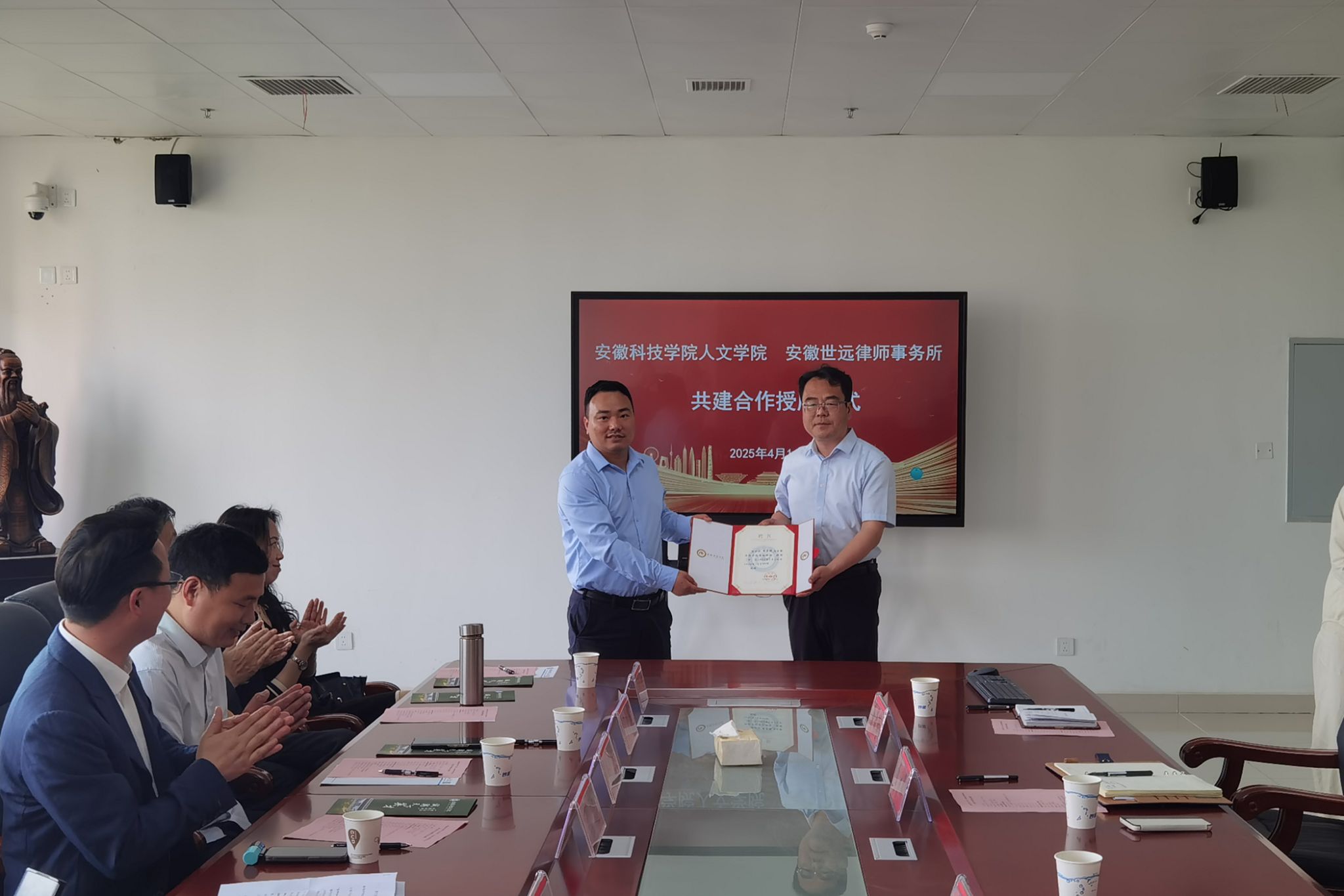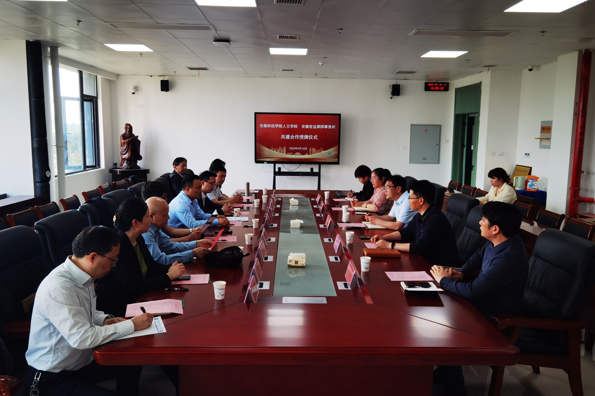 4月16日下午,人文学院与安徽世远律师事务所举行共建合作授牌仪式。安徽世远律师事务所执行主任段永梅,安徽世远(合肥)律师事务所主任程聪,合伙人王应选、侯培培,律师黄保轩、宫厚军、张大成、唐雯、张文艳;人文学院党委副书记、院长李晓东,副院长牛永辉,党委副书记李沙娜,法学系教授骆绪刚,辅导员徐琦琦出席。仪式由牛永辉主持。