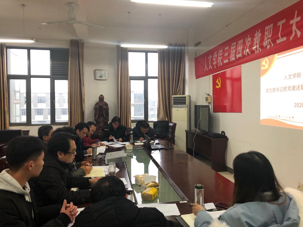1月10日下午,人文学院在学院会议室召开2019年度党支部书记述职评议会。学院党总支书记杜士凤,院长陈传万,党总支委员李晓东、骆绪刚,各党支部书记和师生党员代表参会。会议由杜士凤主持。