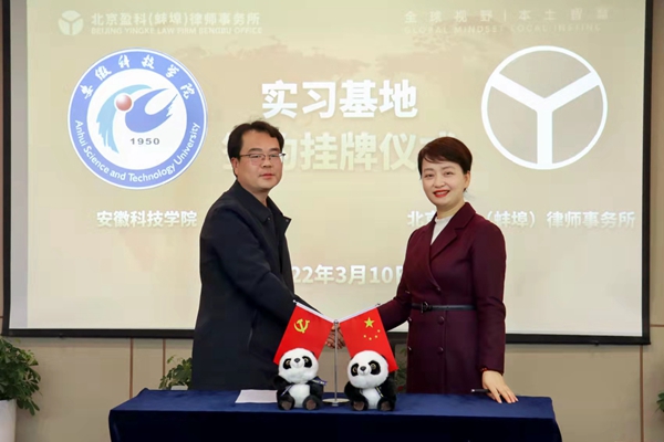 3月10日上午,人文学院党委书记杜士凤、副院长李晓东、党委副书记李沙娜、副院长牛永辉一行赴北京盈科(蚌埠)律师事务所,签署产学研合作协议和就业基地协议。盈科蚌埠管委会主任张丽、党支部书记汪艳、执行主任王旻、执业纪律委员会主任李德、青工委副主任孔繁昌等出席签约仪式。