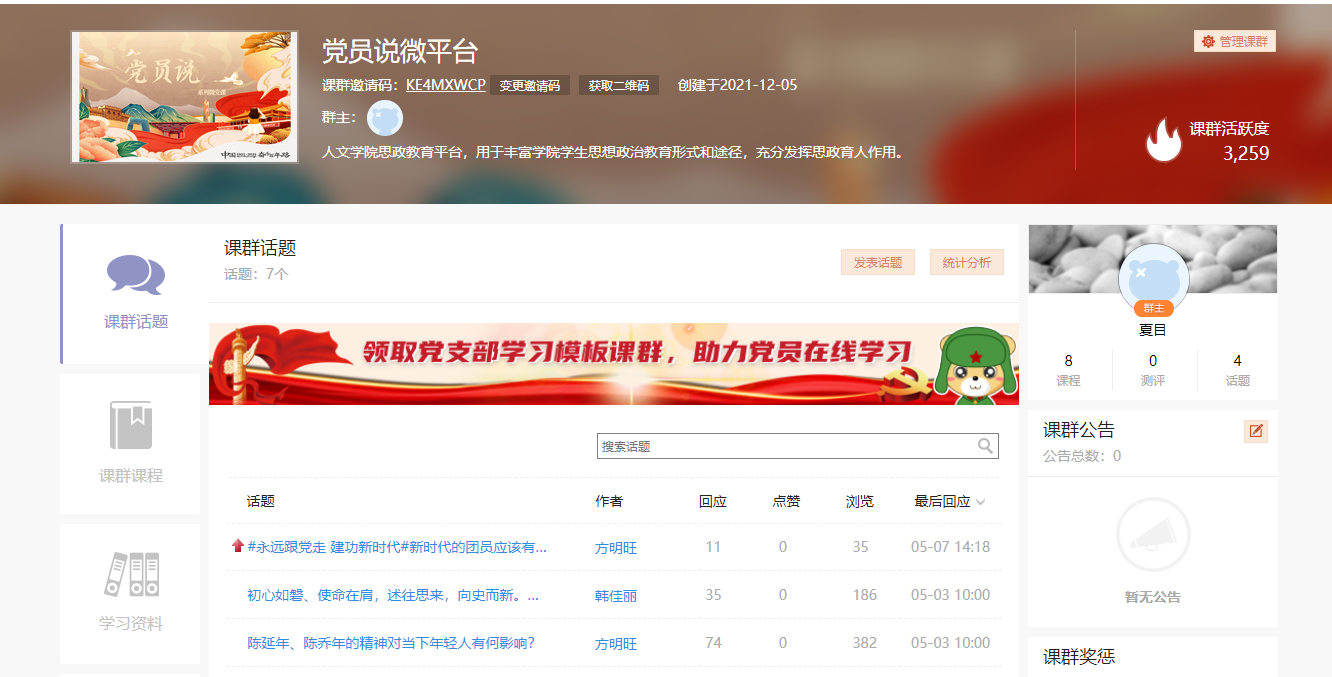 着力打造学院网络思政育人平台,学院利用易班优课平台创建了“党员说微平台”课群,开展党的十九届六中全会知识竞赛,团史知识竞赛,定期在优课课群里发布主题视频课程和话题,供学院学生学习讨论,打造学生自我学习的平台。目前该易班平台吸引了其他兄弟学院近1000多名同学的积极参与和报名,影响力显著提高。