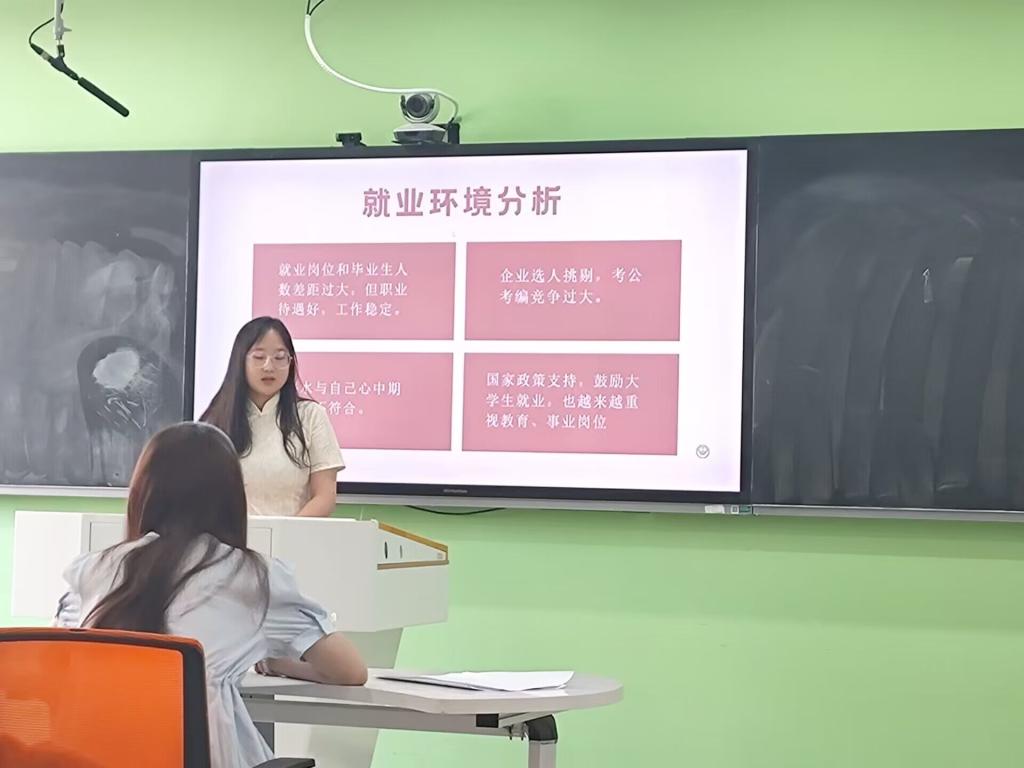 大赛中,同学们满怀自信地畅谈未来,他们从自我认知与定位、职业机会的评估、职业目标的选择、行动计划的制定和灵活调整五个方面运用PPT展示自己的就业规划和创业构思。