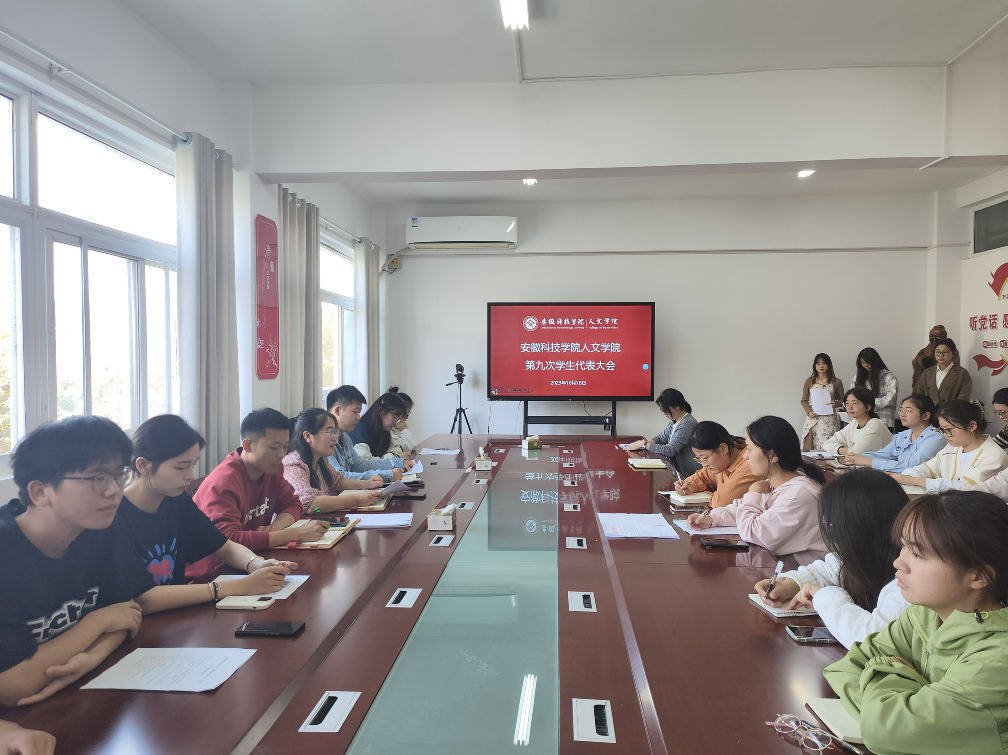 10月18日中午,人文学院在学知楼324会议室召开第九次学生代表大会。学院党委副书记李沙娜和辅导员焦雪松、徐琦琦出席,院学生会主席团成员及学生代表参加。会议由盛化明主持。