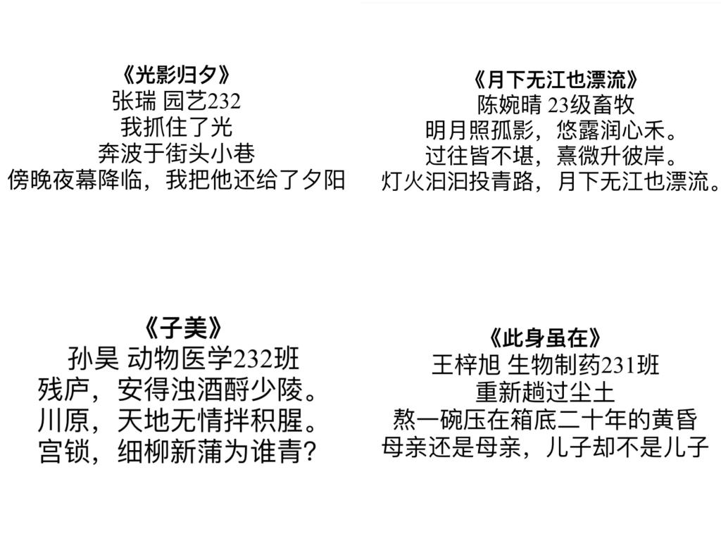 活动过程中,同学们积极参与,踊跃投稿,借用文字魅力与诗歌美学,表达自己视角下的世界。参赛作品音韵和谐,结构严谨,或古朴雅致,或现代浪漫,或妙趣横生,或辞简意赅,表达了对生命的珍视、对家国的热爱,淋漓尽致,妙笔生花。同学们用实际行动,切实宣传和助推诗歌文化遍布校园每一个角落。