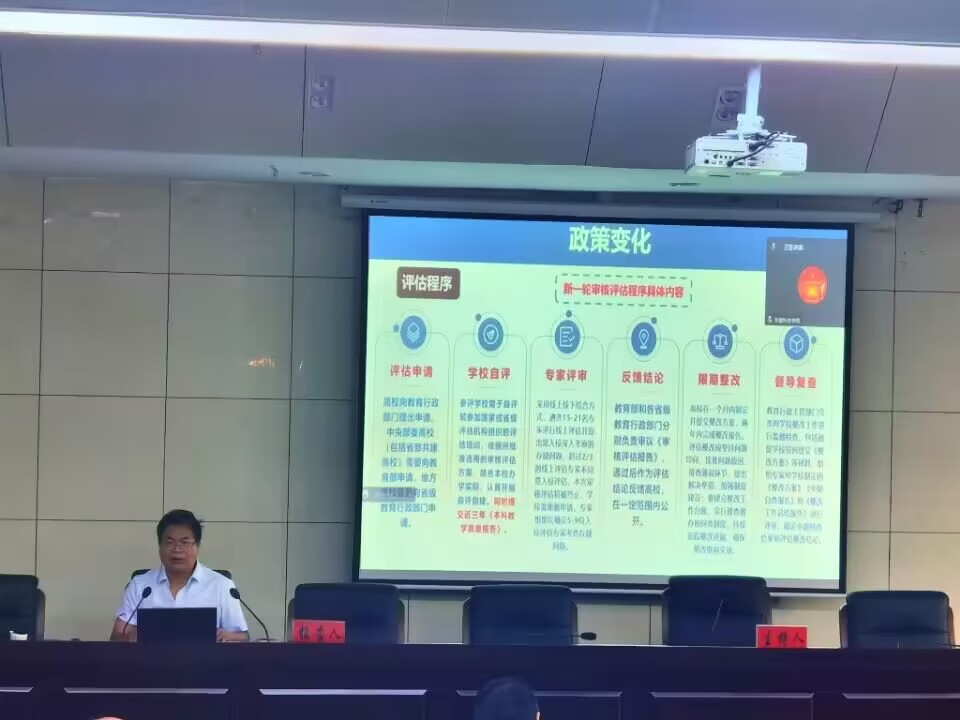 为切实做好本科教育教学审核评估迎评工作,8月23日上午,学校邀请安徽农业大学高等教育研究所所长方明教授在校会议中心一楼报告厅作专题辅导报告。校党委委员、副院长李升和出席会议,本科教育教学审核评估各工作组组长,各职能部门负责人,教学院(部)书记、院长、分管教学副院长、各专业负责人、系(教研室)主任、实验室主任,教务处科级以上干部,审核评估办公室工作人员等以线上线下相结合方式参会。专题报告由李升和主持。