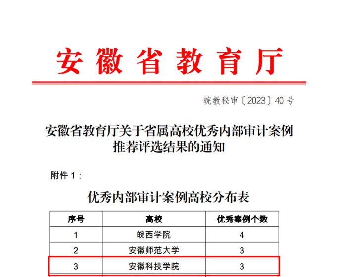 近期,安徽省教育厅印发《关于省属高校优秀内部审计案例推荐评选结果的通知》,全省36所省属高校立足学校内部审计工作实际,择优选报了经济类、管理类、工程类共计99个内部审计案例。经高校互评、专家线上评审,最终33个案例被推荐为优秀案例。开云线上官网_开云(中国)审计处撰写申报的3个案例全部获评“省属高校优秀内部审计案例”,优秀案例数并列省属高校第二。