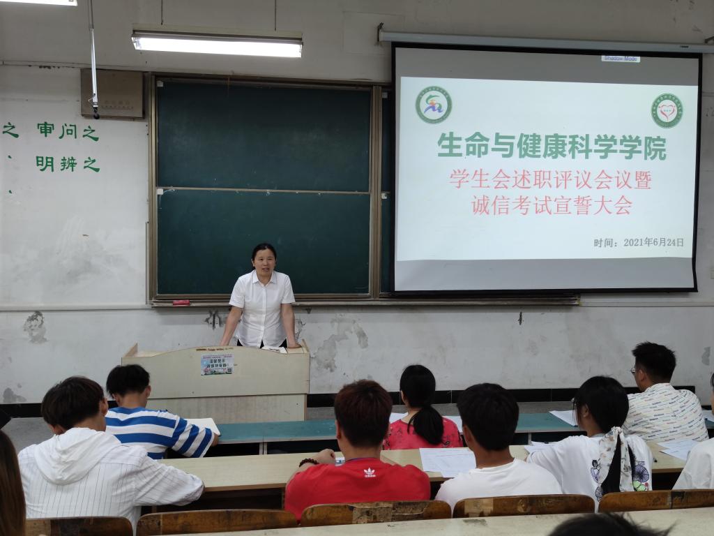 6月24日中午,生命与健康科学学院学生会于求知楼A101教室召开述职评议会议暨诚信考试宣誓大会。学院党委副书记彭丽萍,学院团委副书记姜毅应邀出席会议。学院学生会全体成员参加会议。会议由学院学生会执行主席朱道广主持。