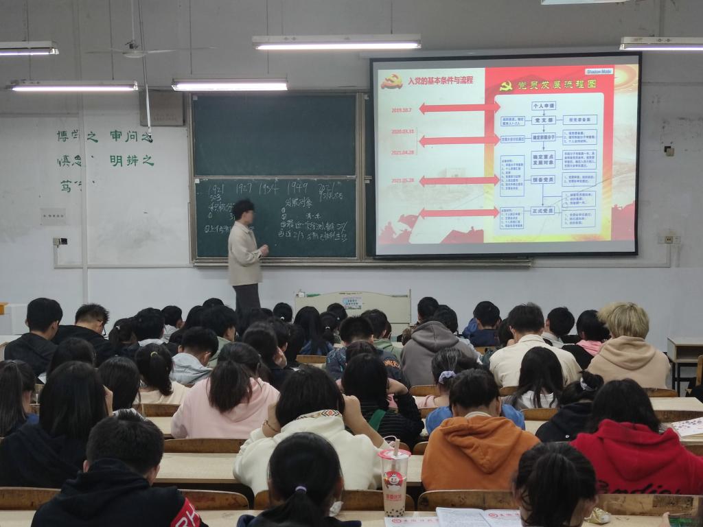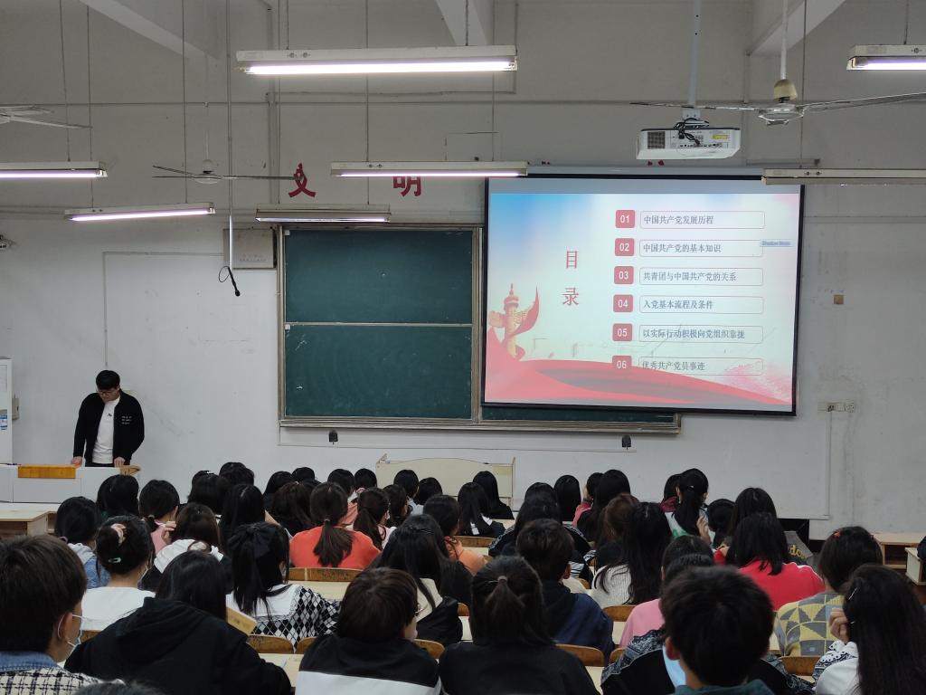 期间,学生党员以中国共产党的性质、中国共青团和中国共产党的关系、同学们在大学期间如何以实际行动积极向党组织靠拢、入党的基本条件四个方面为主线展开讲解。王紫岩以中国共产党成立100周年为背景,向同学们介绍了中国共产党百年来艰辛的发展历程并向同学们阐述了中国共产党的性质、指导思想、初心使命、基本路线,并着重强调了社会主义核心价值观。唐冠金就书写入党申请书的格式要求、组织发展的条件、组织发展的程序等方面进行详细介绍,并鼓励同学们积极向党组织靠拢。最后,唐冠金向同学们讲解了入党的具体流程,同时也为同学们介绍了几位优秀党员,让同学们积极学习他们身上的优秀品质。