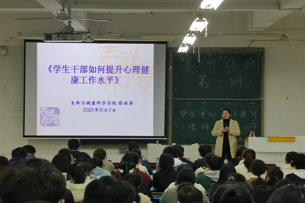 11月7日下午,生命与健康科学学院在新知楼B304教室举办2021年大学生骨干培训之素质培训第一讲。学院党委副书记彭丽萍受邀为此次培训授课。2021级各班班委、学生会21级实习生共计175人参加此次培训。