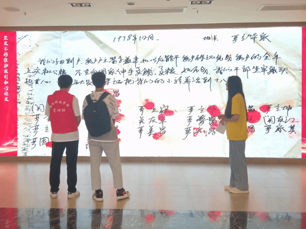活动开展当天,实践团队抵达沈浩同志先进事迹陈列馆进行参观,团队成员们看着馆中展示的沈浩同志遗物,其忙碌在小岗村中的身影浮现在眼前,成员们领悟到了沈浩同志任劳任怨、为人民服务的无私奉献精神。成员们浏览沈浩同志日记发现,文中经常提到小岗村的发展问题,足以看出沈浩同志一心为民,团队成员由衷感到敬佩。随后,团队成员抵达了大包干纪念馆,由讲解员带领团队成员参观。进入大包干纪念馆后,团队成员首先看到的是“生死契约”,在这里团队成员感受到了先辈们当时实行“大包干”的勇气与决心。队员依次参观了大包干纪念馆的六个展区,展馆内保存了大量关于“大包干”的资料以及当时大包干农民用过的部分农具实物,众多展柜展现了小岗村的发展历程,也让团队成员认识到了当时小岗村发展的艰难。在参观过程中,张迪老师感慨良久,她告诉团队成员们要坚定敢为人先、敢想敢做的道理,作为新时代的青年,更应该学习、弘扬和贯彻大包干精神。活动的最后,团队成员将实践过程中收集的材料整理制作成红色图册,并将手绘图册分发给了当地儿童,希望借此将红色精神一代代的传承下去。