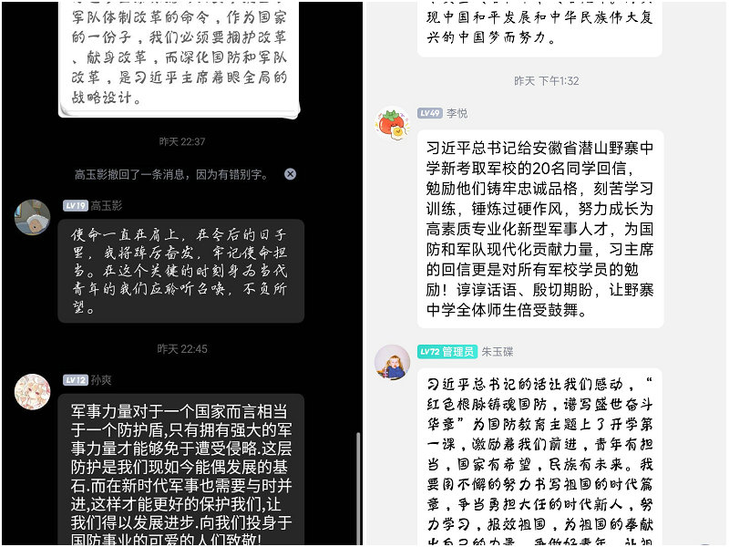 青创中心负责人、生物工程211朱琦同学,在学习《努力成长为高素质专业化新型军事人才--习近平主席给安徽潜山野寨中学新考取军旅同学的回信激励青年学子走好军旅路》的文章后表示,通过此次学习,身为大学生的我们,需要反思自己,赋能升级,深学笃行,做有担当、有作为的大学生。