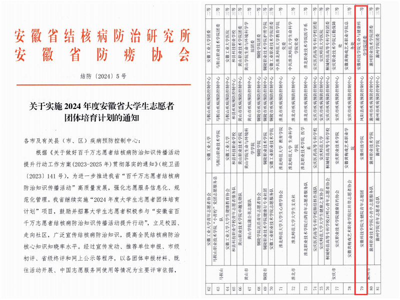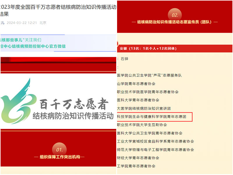 生命与健康科学学院团委自2020年获批安徽省大学生志愿者团体培育计划资助以来,一直秉承“奉献、友爱、互助、进取”的志愿者精神,在校内外积极开展各类志愿服务活动。今年的3月24日是第29个“世界防治结核病日”。生命与健康科学学院青年志愿团已连续7年开展“世界防治结核病日”主题宣传活动。2024年度“安徽省大学生志愿者团体培育计划”评选结果出炉,该团体获得一等资助。同时,该团体分别荣获2023年度安徽省和全国百千万志愿者结核病防治知识传播活动优秀志愿者团体称号,据悉获得全国百千万志愿者结核病防治知识传播活动优秀志愿者团体称号的安徽省有12个。未来,生命与健康科学学院青年志愿团将继续为打造健康校园,共创美好未来而努力奋斗。(特约通讯员:王传林 摄影:朱琦 谢佳梦 陈子涵 卢莲莲 杨青柳 审核:彭丽萍)