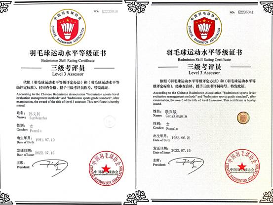 六天的培训严格遵循国家疫情防控管理规定,实行全封闭式管理,培训和考核内容包括羽毛球运动水平等级评定相关的理论知识和实践操作两大部分。孙文树和耿兴敏老师积极参与现场互动问答,认真备考,最终以优异的成绩通过了考核,获得三级考评员的资质。