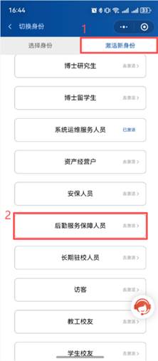 3. 以后勤服务保障人员身份激活为例。点击“身份切换”按钮,选择“激活新身份”,点击“后勤服务保障人员”填写基本信息后点击“提交”,等待审核通过即可。