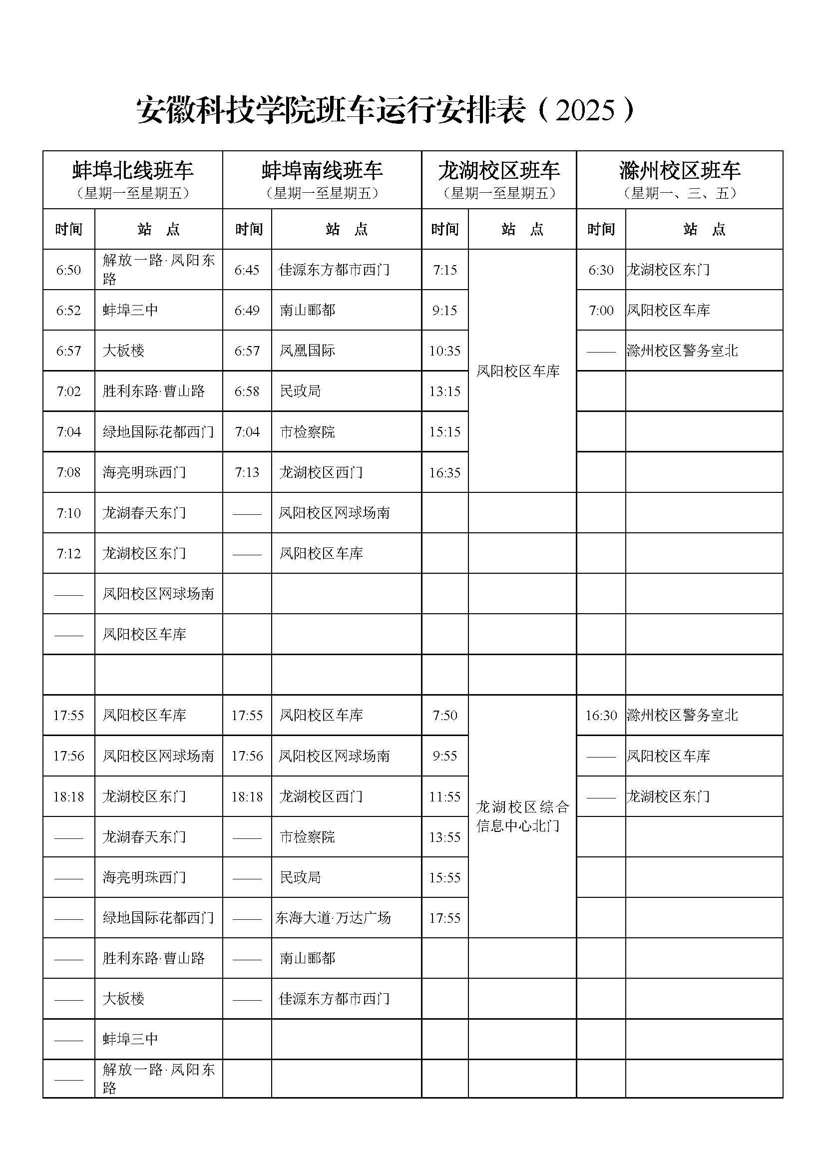 (二)校区班车运行时间为:凤阳校区车库7:30、13:30;龙湖校区综合信息中心北门12:10、17:45。