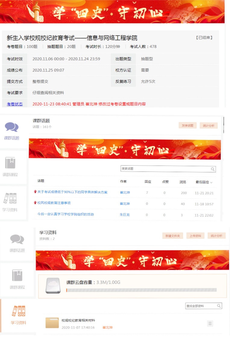 学院充分将易班优课的在线考试、学习资料、课群话题三大模块结合起来,重点围绕资助、综合测评、考核奖惩、寝室管理、学籍管理等内容展开宣教,强化学生对校规校纪的认识。学院四百多名学生积极主动参加校规校纪知识学习并进行在线考试,其中118名同学以满分的成绩通过在线考试,在学习过程中,近百名学生就校规校纪的日常行为规范、诚信文明等内容展开讨论,并表明今后将认真学习校规校纪知识,不断提高自我综合素质,做一名有理想、有道德、有文化、有纪律的新时代大学生。