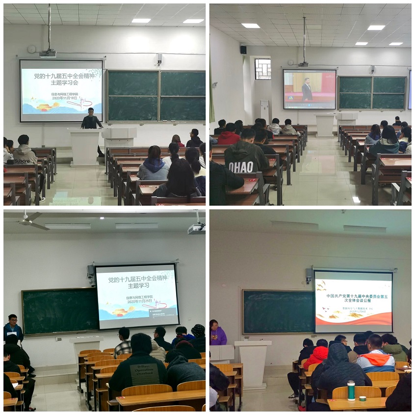 为深入学习贯彻党的十九届五中全会精神,把信网学子的思想和行动统一到全会精神上,信息与网络工程学院在11月至12月,组织各班级开展了党的十九届五中全会精神主题学习会。