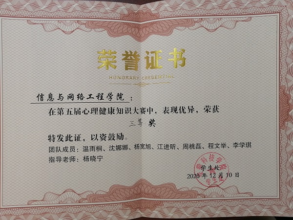 为进一步提高大学生的心理素质,促进大学生的身心健康和谐,传递心理健康知识,创造心理健康氛围。12月12日晚,信息与网络工程学院20级全体于致知楼A开展心理知识竞赛。