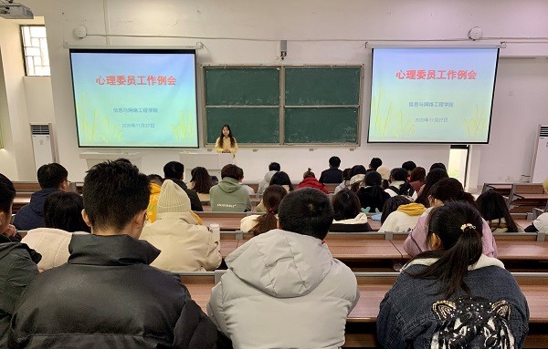 11月27日,信息与网络工程学院在致知楼C111教室召开心理委员工作会议。会上,杨晓宁老师就前期心理工作进行了总结,并对下一阶段重点心理工作进行了说明,特别就四类排查工作及心理委员工作保密纪律、心理委员MOOC培训、心理知识健康大赛进行了具体布置。要求心理委员进一步明确角色和定位,发挥在班级心理工作中的骨干作用,做好班级心理工作的宣传员、观察员和沟通员,利用心理MOOC培训机会,充实心理知识,增长工作技能。