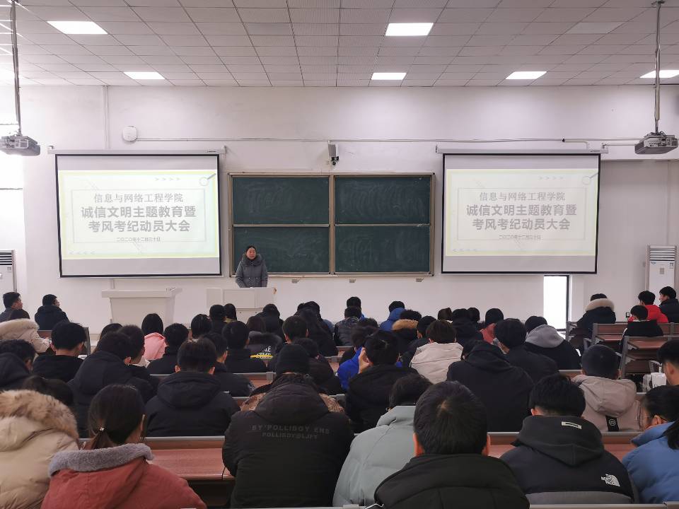 会议分两阶段进行。在诚信文明主题教育活动动员阶段,李军成宣读了《信息与网络工程学院“诚信文明”主题教育活动实施方案》。韦乃学做诚信文明主题教育动员讲话,她分析了开展诚信文明主题教育活动的重要性和必要性,指出诚信文明是立德成才的根本,是大学生必备的核心品质与基本修养,对大学生的未来职业发展、个人成才有着至关重要的作用。引用学生反面典型,对各班级在开展活动时提出明确要求:一是思想重视,广泛宣传,召开主题班会,动员全员参与;二是从我做起,从小事做起,发挥表率作用;三是坚持问题导向,把握重点环节,注重活动实效;四是认真总结,选树典型,巩固成果。