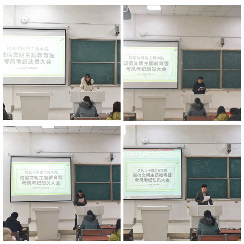 为进一步提高大学生的诚信文明素养,加强考风考纪教育。12月30中午,信息与网络工程学院于致知楼A111召开诚信文明主题教育暨考风考纪动员大会。学院副处级辅导员韦乃学,专职辅导员王培培、陈凯、李军成、崔北坤以及20级各班学生干部参加会议,会议由王培培主持。