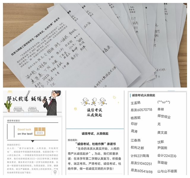 举办“线上线下”诚信考试承诺书的签署。线上通过易班签订考试承诺书,线下以班级为单位签署诚信考试承诺书。为了确保将考试相关纪律要求传达给每一名同学,坚决抵制作弊行为,学院组织各班级同学签署“线上线下”诚信考试承诺书,要求同学们谨记承诺内容、克服侥幸心理、积极备考端正考风、自觉抵制作弊行为,力求达到教育我院学子诚信考试的目的,激发学生学习动力。