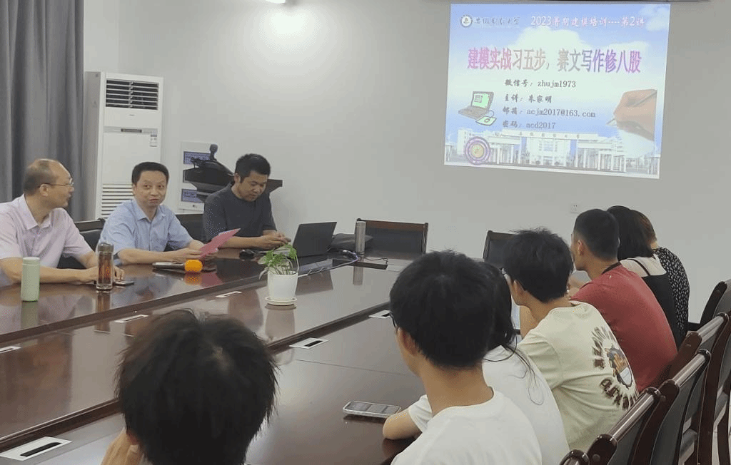 7月12日上午,应信息与网络工程学院邀请,安徽财经大学数学建模名师朱家明教授在尚行楼B418为参加数学建模暑期培训的师生作了一场题为《建模实战习五步,赛文写作修八股》的建模专题报告。报告会由余宏杰院长主持,数学建模创新创业竞赛实验班指导老师及学生60余人参加了此次报告会。