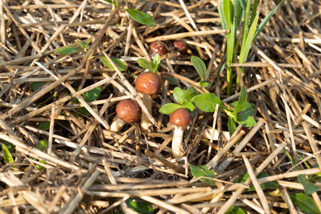 在种植园最北侧,资源利用与植物保护领域研究生公维勇、梅佳、石文彧所在科研团队的露天试验田,有一小片约30m2的土地,其上覆盖着小麦秸秆,从秸秆缝隙里钻出深棕色的大球盖菇。大球盖菇又称赤松茸,其口感绝佳且营养价值极为丰富,深受人们喜爱,需求量快速增长,价格居高不下。目前,常见的大球盖菇的种植方式以大棚栽培模式为主,对环境条件要求较高。试验田就是要解决这一问题,尝试探索秸秆生料栽培大球盖菇的模式。公维勇向观摩的同学们介绍:“建一个大棚约1.5-2万元,成本很高,而我们的大球盖菇种植是直接在露天地里,像种植小麦一样,而且只需要在土壤表面覆盖小麦秸秆,不需要对土壤进行复杂处理,操作非常简单,成本也低。”据他介绍,30m2的种植面积,一个早晨他们就采摘了近20斤大球盖菇,每天都能出菇。但是相比大棚栽培模式,秸秆生料露天栽培出的大球盖菇体积和品相略有欠缺,还需要进一步的试验探索。