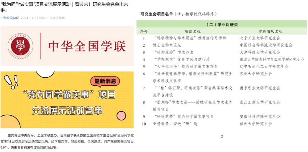 近日,全国学联发布了2023年度全国高校学生会组织“我为同学做实事”优秀项目交流展示名单,开云线上官网_开云(中国)研究生会《“研途筑梦”我为同学做实事项目》成功入选。本次活动由共青团中央指导,全国学联主办,贵州省学联承办,自启动以来,经学校自荐、省级推报、全国遴选,最终共有62个研究生会项目入选全国学生会组织“我为同学做实事”优秀项目交流展示活动。