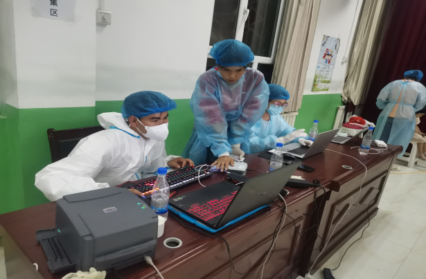 实践小分队除了利用发挥自身的专业特长,还开展了内容和形式多样的志愿服务。例如,为实践地的孩子们开展趣味课堂;担当热心助力的“小老师”和政策宣讲的“小能手”;在村委会和文化活动中心协助整理资料和书籍(图4),对村干部进行办公常用软件使用技巧的培训,分享计算机学习网站与学习视频;看望当地的孤寡老人,倾听老人的故事,在送“陪伴”的同时,感受人间烟火;协助“访惠聚”工作队组织村民开展每周一次的核酸检测工作(图5),完成村民的身份信息登记、核酸检测凭证分发、维持核酸检测现场秩序等工作。