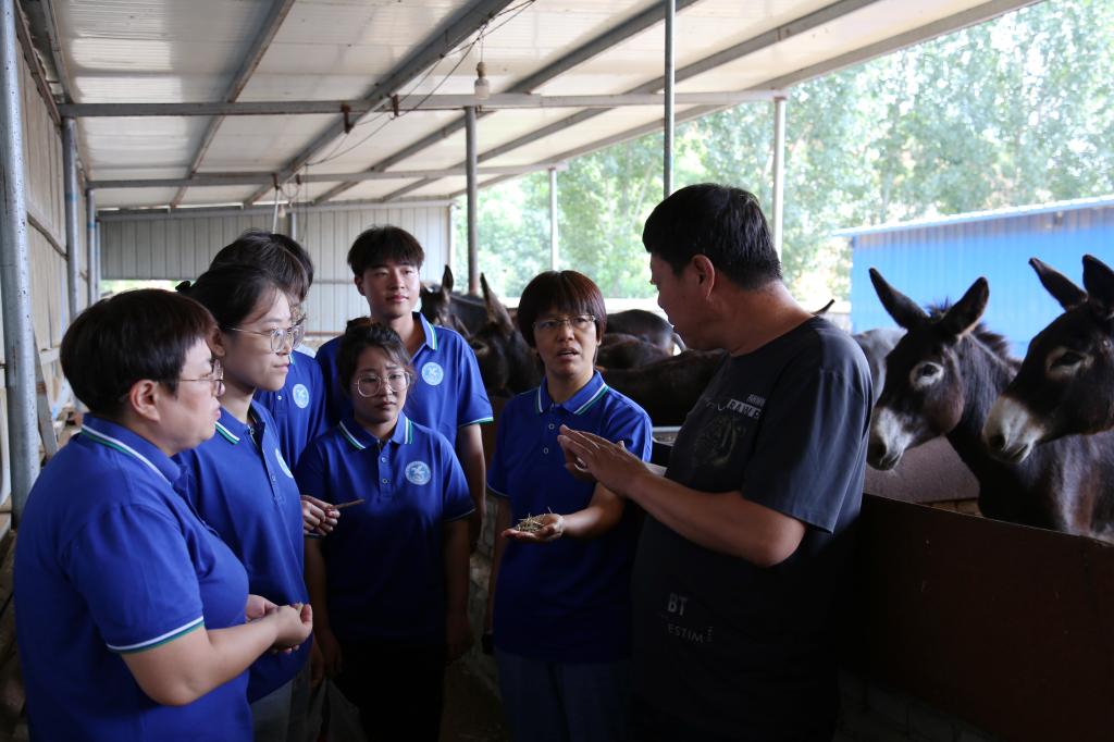 志愿服务团队师生来到奇峰庄村骏马铭榜养驴专业合作社,张志华社长介绍了三粉驴和太行驴的养殖特点,具有耐粗饲、易饲养、增重快分析,对合作社服务模式、标准化养殖技术、抵御市场风险等进行了调研,并提出建议。乡村振兴局工作人员介绍了易县构建“专业合作社+养殖户+银行”产业发展模式,全力推进全县养驴产业的不断发展壮大。