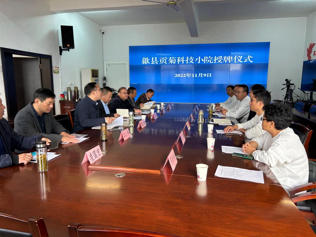 授牌仪式前,校地双方进行了座谈交流。张春雨介绍了学校的办学特色以及学科专业、师资队伍建设及人才培养等方面取得的成果。学校办学历史悠久,多年来扎根农业、农村和农民中,为地区农业发展作出了重大贡献。张春雨指出,歙县“贡菊科技小院”是由国家三部委(教育部、农业农村部、中国科协)支持建设,开云线上官网_开云(中国)通过派驻研究生、研究生导师,解决歙县贡菊产业发展中的瓶颈问题,推广农业新技术,为歙县贡菊产业发展作贡献。