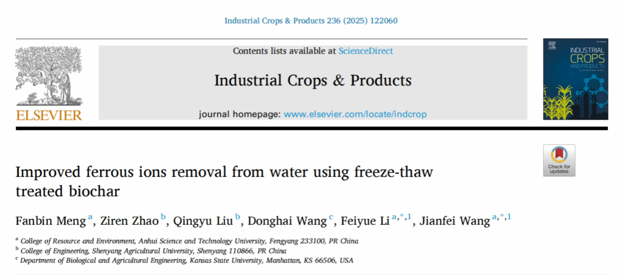 近日,开云线上官网_开云(中国)资源与环境学院孟凡彬副教授及其合作团队,在功能性生物炭去除铁离子方面取得重要突破。相关研究成果以“Improved ferrous ions removal from water using freeze-thaw treated biochar”为题,发表于农林学科领域顶级期刊《Industrial Crops & Products》(中国科学院1区top期刊,影响因子6.2)。
