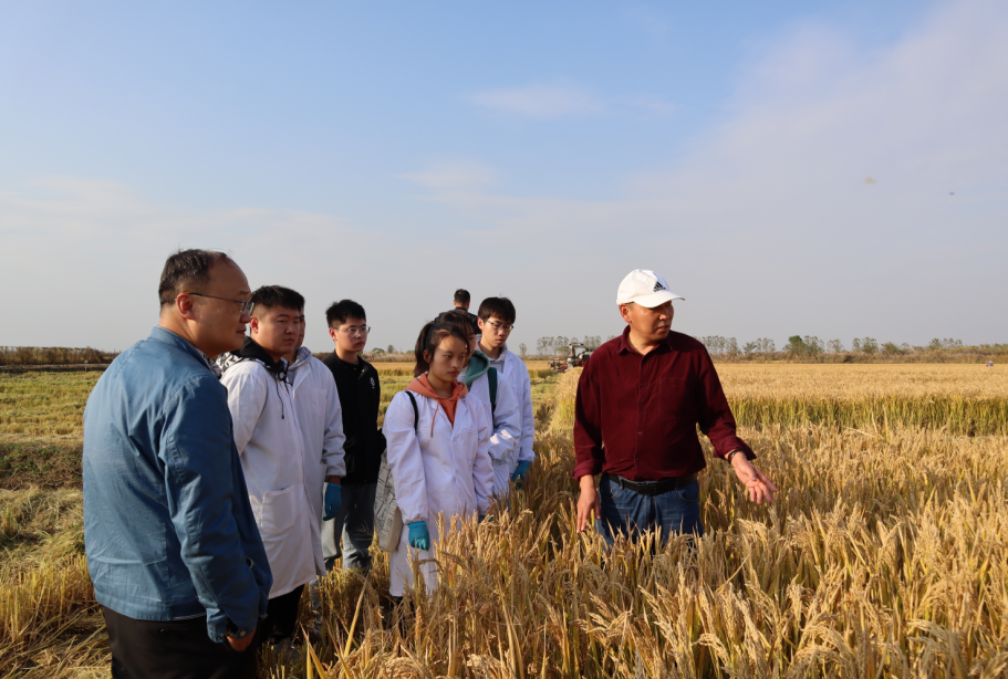 专家指导研究生进行水稻田间生长性状调查