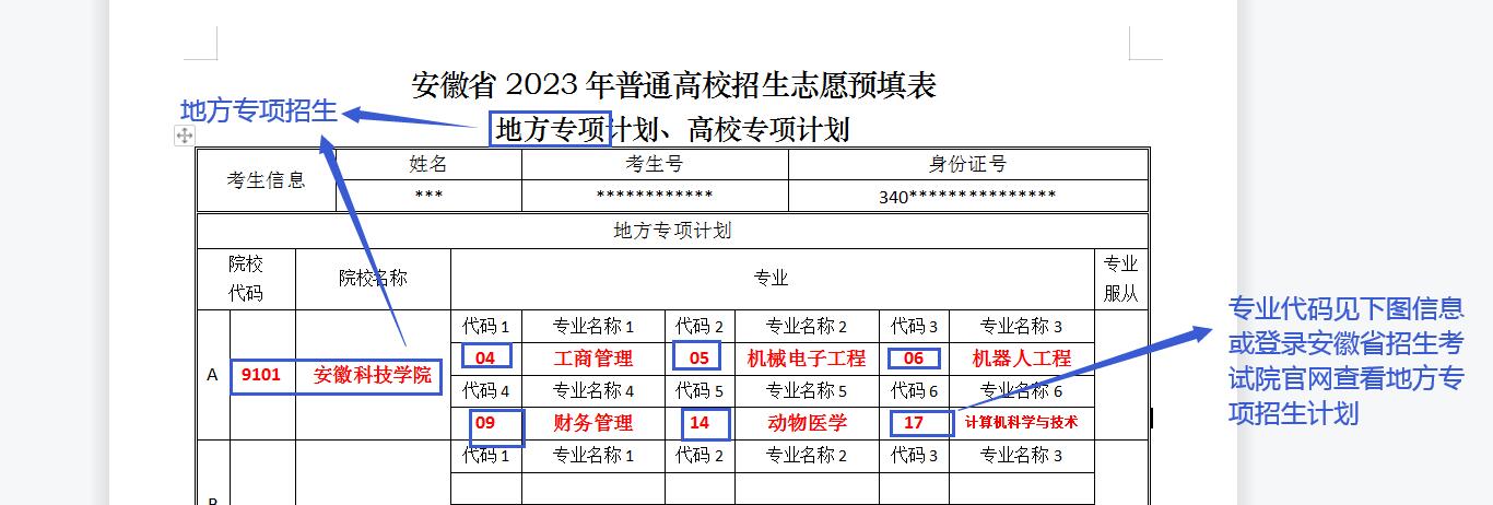 地方专项招生专业代码等信息如下:
