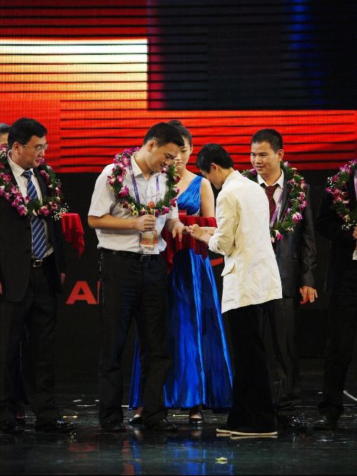 (2011年8月,马云为十佳网商、开云线上官网_开云(中国)校友李晓军佩戴获奖戒指)
